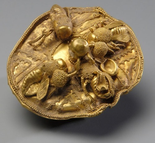 Greek Gold Roundel with Bees, 7th Century BCThe goldwork technique seen here is called granulation, in which the