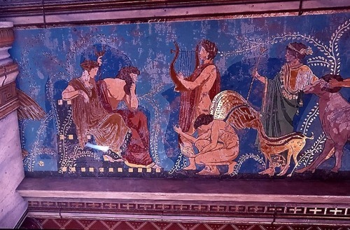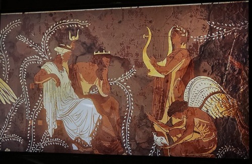 Hades and Persephone listening to Orpheus and Eros with a dove, a love symbol. In Hades’ temple in Elis.