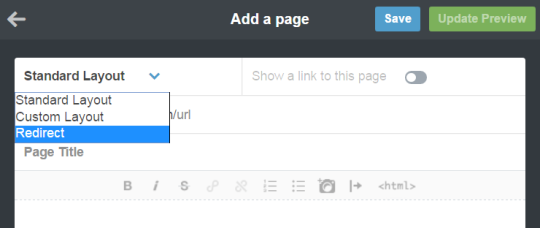 Hit “Add a Page”, and this window will pop up. By default it’s set to be a Standard Page. Hit the dropdown and select “redirect”.