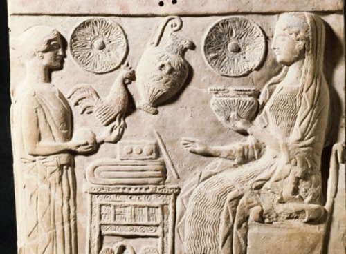 Remember Persephone was the goddess of renewal, so at least in Locri, the cock was an usual attribute of her. And in other cultures cocks-chickens were seen as animals related to renewal and life (eggs have that symbolism tooo).
