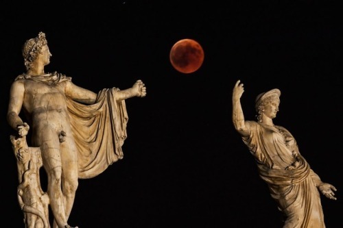 The blood moon is framed by the statues of Hera and...