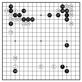 I'm White. So far things are pretty groovy. Black has a monstrous amount of territory at the top. He has maybe 35-40 points easy. It's a lot of points, but I've got my moyo of justice! Black plays at 39 which is a good move to move into my moyo. So, my moyo is deep, but thin, whereas Black has locked up a lot of points, but in the process, his framework on the right side is largely broken up or has gaping holes. I have yet to decide how I'll deal with Black 39.