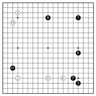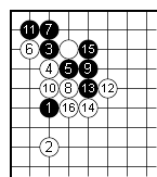 This problem was tricky because it involves sacrificing so many stones, and visualizing the shape after each sacrifice. The idea is simple: The lower right corner is a an eye in gote. That means we have to get rid of one of White's eyes on the left. In this case, we can create a two way street. Black 7 threatens White's eye, now if White wants to make a gote eye in the corner, he can't save his other eye. This one was tricky!
