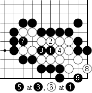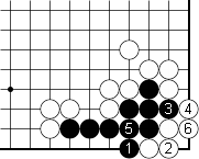 Normally it goes like this, and I thought it would be decent for both sides, but Black chose a good sequence and I think both sides were not too far off from one another. We'll see how the game progresses. I'll have to go into my arcane den of the dark arts of Go and figure out how to deal with Black's attachment...