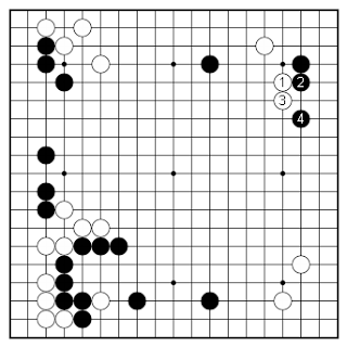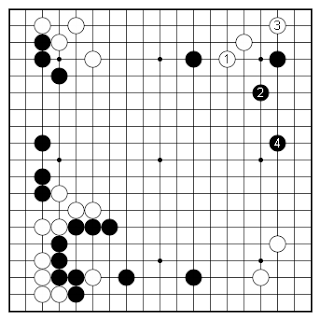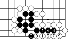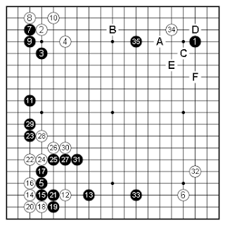 I ruled this standard sequence right out. White 1 and 3 are defensive moves and Black settles ridiculously easy on the right, and my lower right corner enclosure is ...well just two stones making a handful of points; nothing more. This also doesn't use my thickness effectively.
