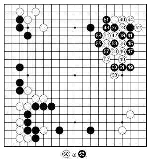 So Black squeezes the crap out of me. Black 51 is sente and I don't have any crosscut antics on the right side. Instead, I'm forced into a brick and Black spears through with 63. We don't need to go over the rest of the game; it's really too horrible to watch. I've already lost. That's the one thing I don't like about higher level Go: if you make a really air-headed mistake, the game is over. There is nothing more to do. When I was 6 kyu it would've been possible to come back from this. In any case, the tournament continues either this Saturday or next. University of Michigan faces off against Princeton. I hope I don't have to play Michael Chen...