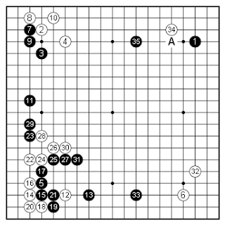 Here's the first part of the game. Not a lot to write home about. The lower left is a not quite joseki. I came out with 24 to fight against Black sealing off the center since him having influence in the lower left quadrant would make the game hard on White. Black could've cut instead of extending with 27, but Black 27 is one of his choices. I pushed one more time to make double sure that this center area doesn't materialize. Black can peep to reduce my corner, but that's small now. Now, Black pincers with 35 to breakup a possible White territorial framework along the top. I kind of regret White 34, it should be one higher at A. Works better with the thickness in the upper left. Now, Where should White play? We have a corner enclosure in the lower right and some thickness in the upper left. We don't have as much territory as Black.