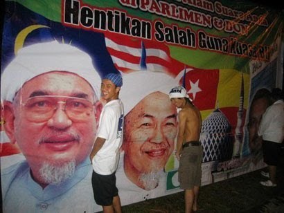 KEMAMAN: Dewan Pemuda PAS Kemasek membuat satu laporan polis berhubung sekeping gambar yang sedang tersebar di internet,mempamerkan aksi dua orang pemuda sedang kencing di atas gambar Tuan Guru Datuk Nik Abdul Aziz Nik Mat dan Datuk Seri Tuan Guru Abdul Hadi Awang pada satu kain rentang.[image error]Laporan polis itu dibuat AJK Pemuda PAS Kemasik, Syed Khairi Amir oleh di Balai Polis Kerteh kira-kira jam 5.30 petang semalam..