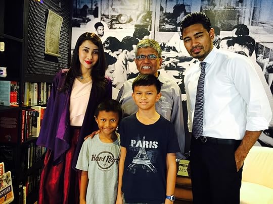 Rita Rudaini bergambar bersama dengan dua orang cucu Zainuddin Maidin, Zulhailmy ( kiri )dan Zulhilman (kanan) dan seorang lagi pelakon Ezzrin Loy setelah siap penggambaran sebuah babak dari telemovie QIAM di Zam Newsroom Cafe Ayer @ 8 Presint 8 Putrajaya.
