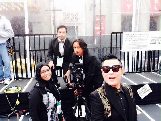 Zaidan berambut panjang bersama Aznil dan dua orang lagi menunggu masa penggambaran Upacara Permaidani Merah Anugerah Academy kali ke 87 di Hollywood baru- baru ini.