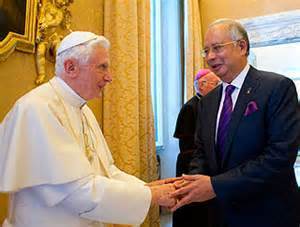 Perdana Menteri Datuk Seri Najib dengan PopeBenedict XVI di Vatican, 2011Perdana Menteri Datuk Seri Najib Tun Razak memberi jaminan kerajaan pimpinannya akan terus meninggikan syiar Islam, menjaga dan mempertanhkan kesucian Islam termasuk kalimah Allah ( Utusan Malaysia 15 Julai).