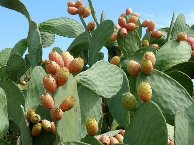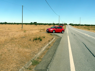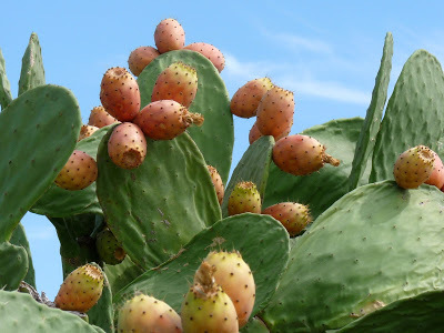 Depois de termos estado em Mourão (ver post do dia 22), e estando o depósito do carro quase vazio, resolvemos ir meter gasolina a Espanha, que é bem mais barato (já foi em 2010, mas a situação era idêntica). No caminho para a fronteira, viam-se, na berma da estrada, muitos figos de cacto, o que encantou o Horst, pois na Alemanha não há destas coisas. De regresso, parámos o carro em plena planície alentejana, a fim de ir fotografar os frutos, que, em Setembro, estavam ainda um pouco verdes.