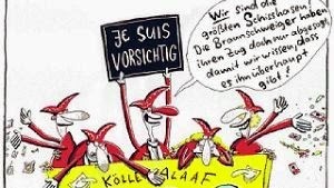 No cartoon, alusivo ao Carnaval de Colónia, retrata-se uma disputa entre os medrosos. Vê-se alguém que segura o dístico Je suis vorsichtig - a palavra vorsichtig significa cuidadoso, ou cauteloso -, enquanto alguém reclama o título de mais medroso, afirmando: nós somos os mais cagarolas! Os de Braunschweig só cancelaram o seu cortejo para que soubéssemos da existência do dito.