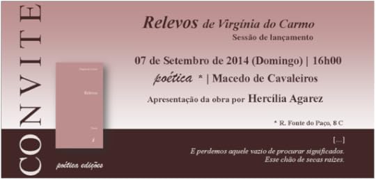 É já no próximo domingo, dia 7 de setembro, que é lançado Relevos, o livro de poesia de Virgínia do Carmo, que, além de poeta, é livreira em Macedo de Cavaleiros e minha editora. A apresentação da obra será feita por Hercília Agarez.