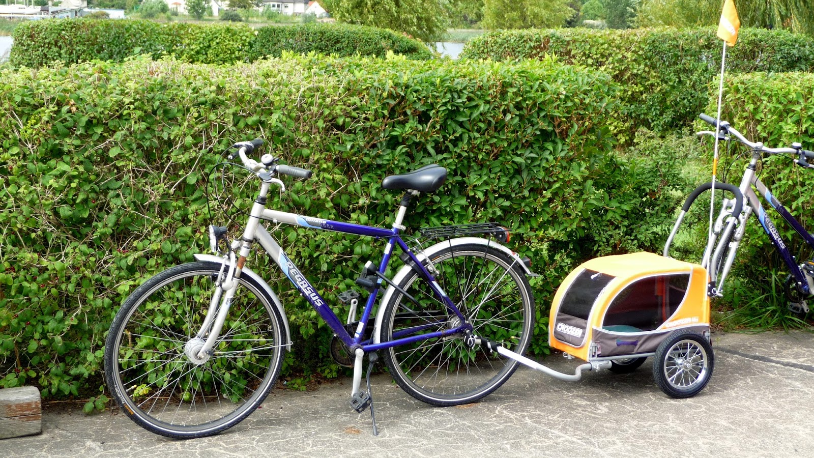 Foi o golpe de misericórdia! Bicicleta? Só na Alemanha! Eu própria a uso mais do que o carro. E porque a nossa cadela é pequena demais para correr o tempo todo ao lado, arranjámos-lhe um atrelado. Ora vejam, que luxo!