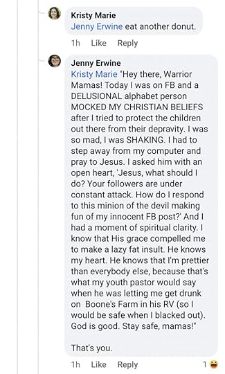 Jenny Erwine: Kristy Marie “Hey there, Warrior Mamas! Today I was on FB and a DELUSIONAL alphabet person MOCKED MY CHRISTIAN BELIEFS after I tried to protect the children out there from their depravity. I was so mad, I was SHAKING. I had to step away from my computer and pray to Jesus. I asked him with an open heart, ‘Jesus, what should I do? Your followers are under constant attack. How do I respond to this minion of the devil making fun of my innocent FB post?’ And I had a moment of spiritual clarity. I know that His grace compelled me to make a lazy fat insult. He knows my heart. He knows that I’m prettier than everybody else, because that’s what my youth pastor would say when he was letting me drink Boone’s Farm in his RV (so I would be safe when I blacked out). God is good. Stay safe, mamas!”