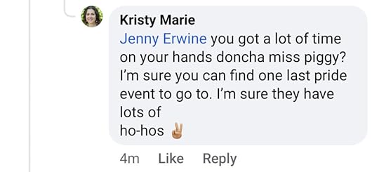 Kristy Marie: Jenny Erwine you got a lot of time on your hands doncha miss piggy? I’m sure you can find one last pride event to go to. I’m sure they have lots of
