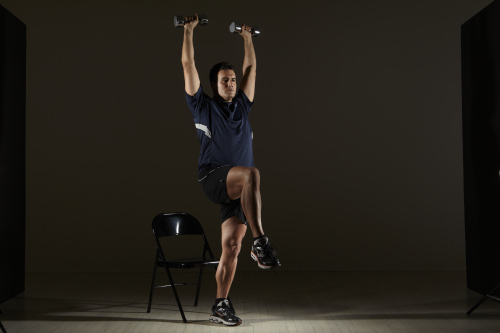 In a seated chair, stand tall on a firm secure chair, chest out core engaged spine straight feet less than shoulder width arms bent in a ninety degree angle next to your head hold 10 lbs dumbells palms facing front, stand up and simultaneously raise your right leg up and your arms overhead make sure your posture is straight at all times.. Sit down again and repeat with the other leg. This is one rep. Do it 10 times. beginners do it three times and more advanced 5 times