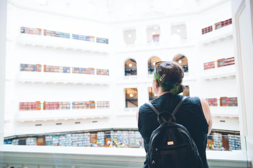 @amiekaufmanauthor looking pensive and lovely, and rocking badass hair, at the @library_vic State Library of Victoria.