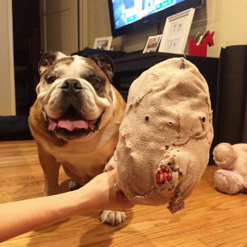 This is Piggy. He was once a stuffed piggy toy for our friends’ @spookybulldog dog Potato, but as his tail and then two front legs were eaten off, he was restitched over and over into this adorably horrifying Guillermo del Toro-esque creature