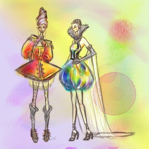 Two morning hours at the airport meant some time to fashion sketch: haute couture from Legend (left) and from The Young Elites (right).