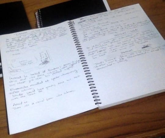 I use notebooks to jot down ideas, to do scene planning, and to do rough stream-of-consciousness writing when I can't get good language to come out. Here's a collection of all the notebooks I used during the 18 months I worked on Kings Rising.