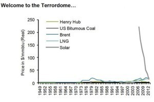 Some interesting news in from Bloomberg concerning energy research – a new report by Deutsche Bank indicates that solar energy is about to reach price parity with conventional electricity – and keep on going down, getting cheaper with every year (hint: solar panels are mostly based on semiconductors – so share the PC chip’s ability of sliding tech costs over time).