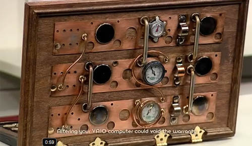 Sony called in steampunk artist John Dunn of Baroquestone.com to give Sony's VAIO F Series Laptop a complete steampunk makeover. Dunn created a custom design he calls the eCog Mercury. The initial sketches took over two weeks just to design before a single gear attached or copper detail was soldered.