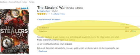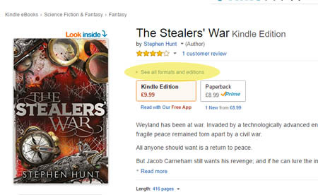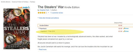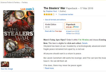 Amazon hiding the buy button on The Stealers’ War print edition three levels deep. Making it so hard to buy, I couldn’t even find the new print book’s order button until I phoned my agent, thinking the Amazon database hadn’t been updated properly with the new book, and he had to tell me how to access it.