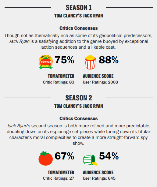 After initially alluding to Jack Ryan's "Boy Scout" image (which is the quintessential feature of his character), he immediately sleeps with an unknown woman but likely to be (and in fact is) an intelligence agent of a foreign government. I just can't imagine Tom Clancy's Jack Ryan ever engaging in such reckless personal behavior.Speaking of sleeping with a foreign intelligence agent, whatever happened to Jack's girlfriend/fiancée/eventual wife Cathy Mueller? In season 2, Jack is portrayed as single with no hint of Cathy anywhere within the season.The ambush scene in the first episode was a complete rip-off of the ambush scene in Clear and Present Danger, to including the death of a close friend of Jack which serves as his motivation for the rest of the movie/season.It was immediately obvious to me (someone who doesn't necessarily do well in picking up on signaling or foreshadowing) that Senator Chapin was going to be one of the bad guys.It was even more obvious that when Matice split up with his team he was going to be killed. I suppose this shouldn't have been much of a surprise but this is an overused trope.Here's a comparison of the Rotten Tomatoes scores for the first two seasons. Although critics were slightly less favorable in their Season 2 reviews, audiences were much less impressed.