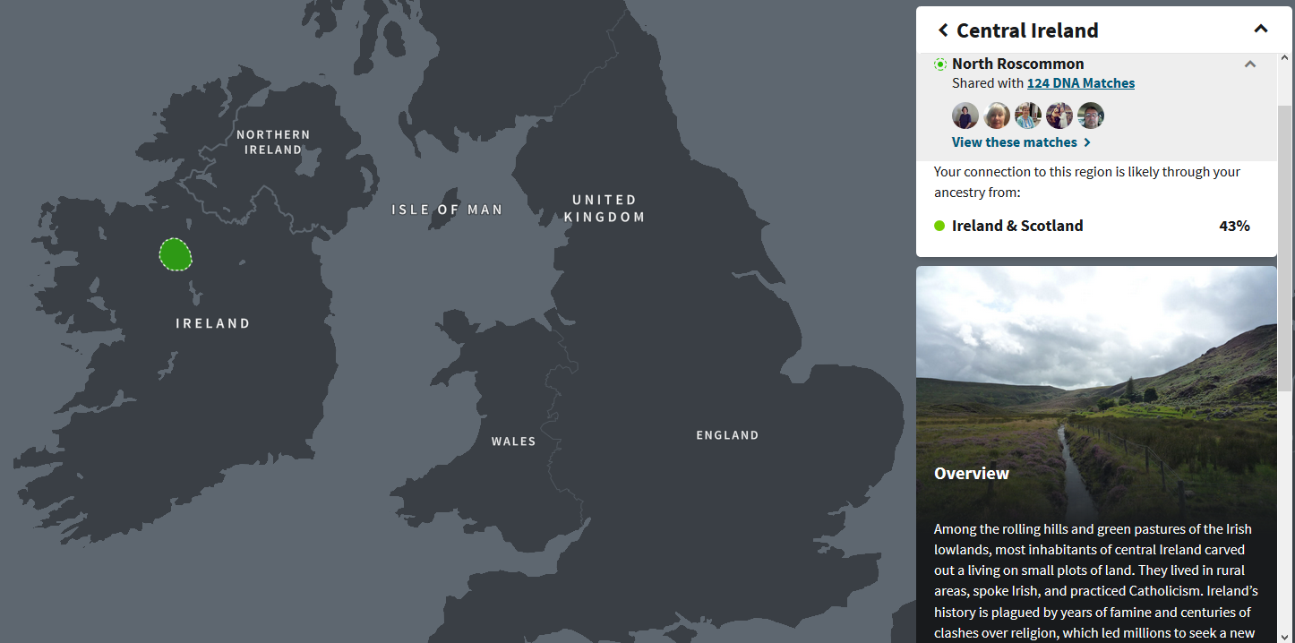 So, this is really cool. AncestryDNA just released another update to their analysis which provides considerable more geographic granularity. In my case, they've broken down Ireland into 92 (!) smaller regions, and placed my origins into North Roscommon, which is a smaller area in County Roscommon centered around the small town of Elphin. Ancestry will then link you to DNA matches who are also from that small region. In my case, there are 124 matches (and several that match my birth surname). Add to this the fact that a number of historical records show that my ancestral family is from this very region.