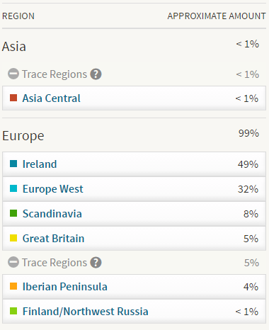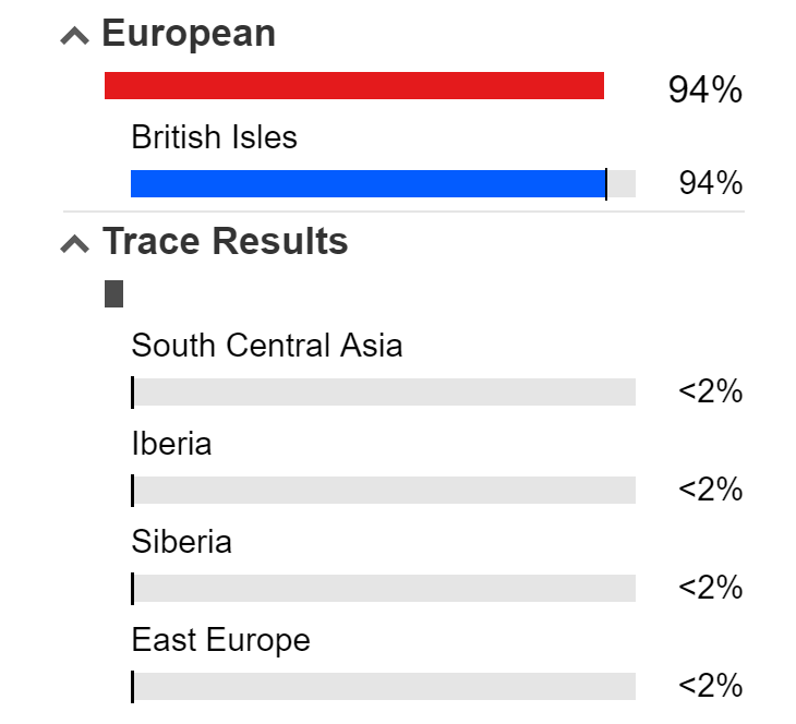 The website notes that "[a] trace percentage indicates a very small amount of shared DNA in common with the coresponding population. In some cases this minor percentage could be attributed to background noise." So it's not clear if if actually have any ancestry from the trace regions, but it is possible. Now, here are FamilyTreeDNA and Ancestry side by side: