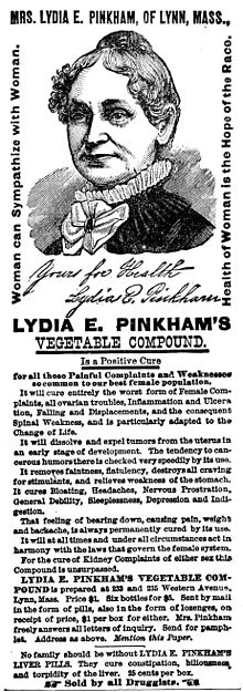 Lydia Pinkham’s was a herbal remedies firm located in Lynn, Mass. The best-known product, Lydia Pinkham’s Vegetable Compound, was distributed until the 1930s when the FDA labeling laws forced it to change its ingredients. (Patent medicines back then had huge alcohol content and often opium as well.)