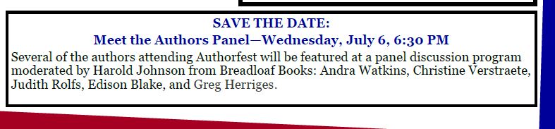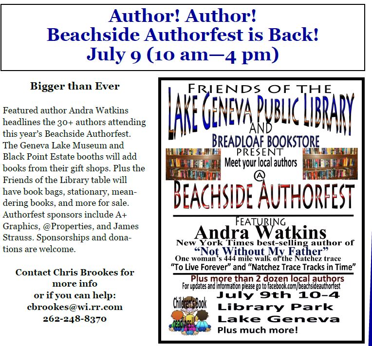 I'm participating in an author panel tomorrow, Wednesday July 6 at the Lake Geneva WI Library...