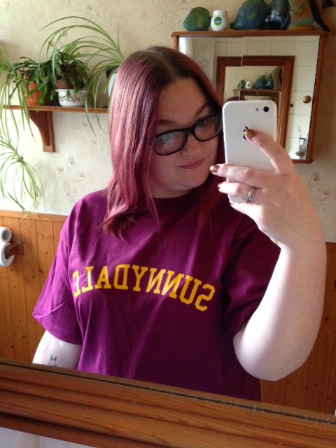 It is almost a replica of the one worn in the gym classes by Buffy and company in numerous episodes ranging from the first to third season. The Sunnydale High School colours are traditionally burgundy and yellow, so I could show my fictional school spirit and still be loyal to the fandom. In a sense, I could cosplay a Sunnydale High School student! I bought a size L (Large) as I like room in my shirts, and this was a men's fit anyway. It arrived two days after I placed the order, which greatly surprised me. It fits great - enough room to move, looks great with either leggings or jeans, and completes the fangirl in me!