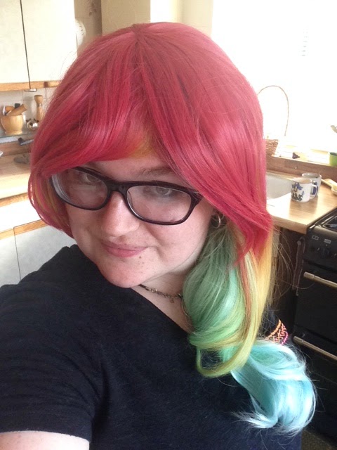 This is so cute and bright! This wig was my original order, which had been delayed with shipping from oversees. I had not expected this to arrive after speaking with the owner of Geisha Wigs, and put my cosplay plan's on hold. This wig will be for my Princess UniKitty - Business Costume from The Lego Movie. I was presently surprised when I arrived home from work, saw the purple wrapped parcel and found this. I wore it straight away.