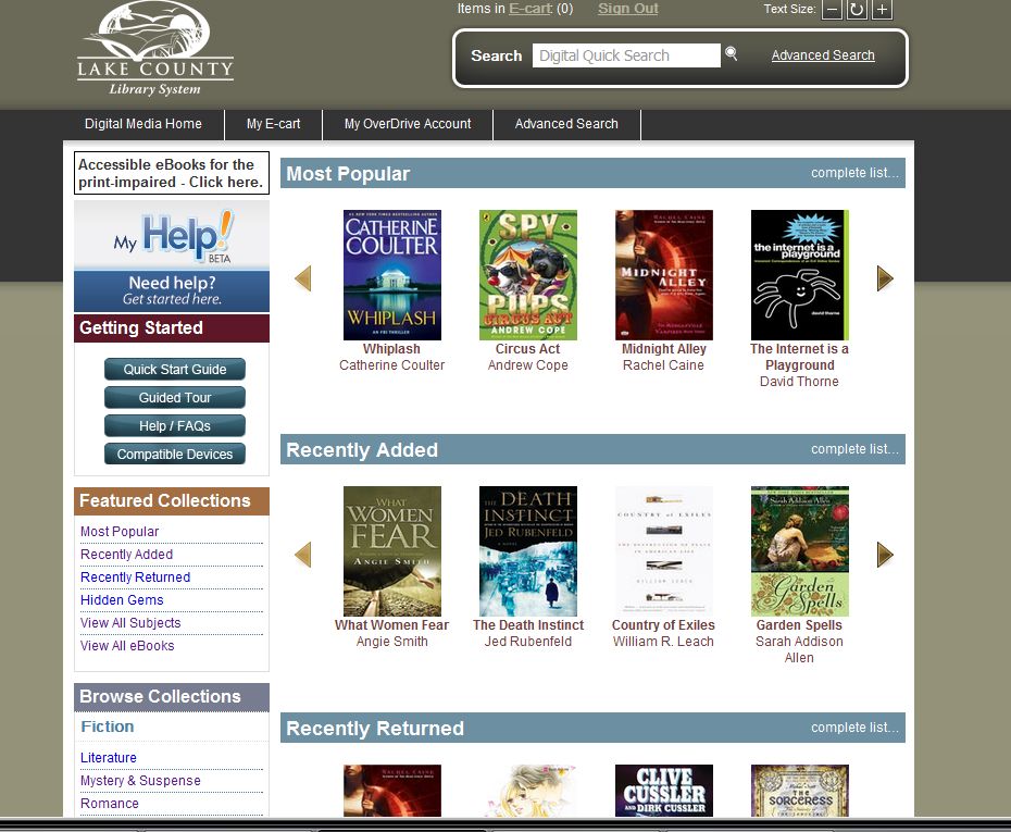 Each library has it's own ELibrary site. Lake County, Florida has theirs at mylakelibrary.lib.overdrive.com . It is set up like an online store. You choose the book you want to borrow, add it to your chart, then check out. Within seconds you're reading your...