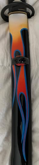If I had it to do over again, I’d sand the saya down to bare wood, primer it white, and fade the ends (I have an airbrush now). Then I’d mark out the flames with fineline tape, mask them, and paint the saya black. Remove the tape, pinstripe the flames, and clearcoat the whole thing. Soooo much less work.