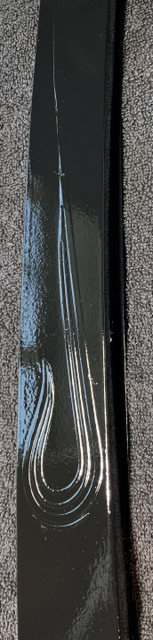 For the final polish, I didn’t use rubbing compound because there was a chance it’d damage the pinstriping, and I didn’t clearcoat the flames because it would have been clearcoating the already-coated black sections of the saya. D’oh. So I just waxed it with 3-4 layers of Turtle Wax and called it a day. (Well, a whole lot of days.)