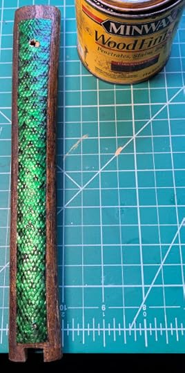 Finally (yep, four big mistakes here): I used decent kitchen shears to cut the rayskin. Yeah, no. Don’t do that. This stuff is amazingly tough and abrasive, and  I ruined the shears. Tin snips next time! Also: Probably best not to ever fight a stingray.
