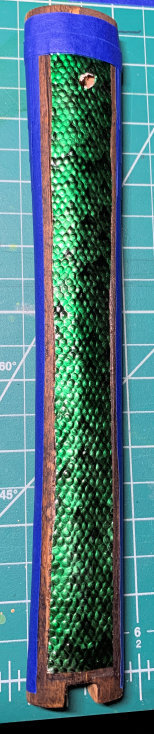 I scaled the marked panel and a band near the koiguchi. I also scaled the samegawa, but I screwed up and had the scales going the wrong direction (I’d already cut the pieces to fit the tsuka). D’oh.