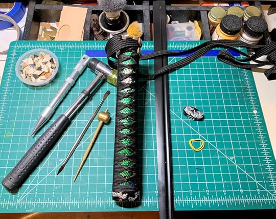 Katana have been a big deal in my novels Ariel and Elegy Beach, and I’ve owned a few cheap iaito (dull practice swords), and trained with them (unsupervised and wholly ignorantly).  Once I started Batto, I found I really wanted to learn more about the swords themselves: Take them apart, clean them, repair them, maintain them–and customize them.