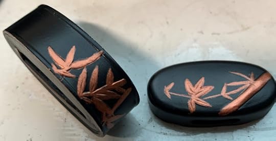 I airbrushed the tsuba, fuchi, and kashira jet black, then brush-painted the decorations with the metallic copper: