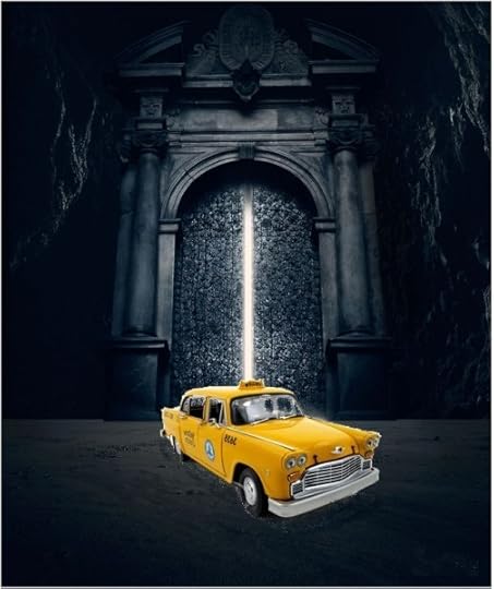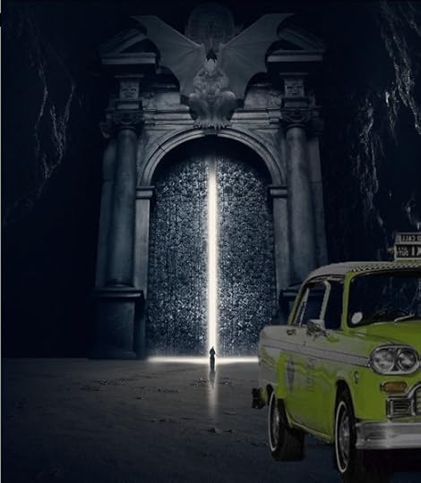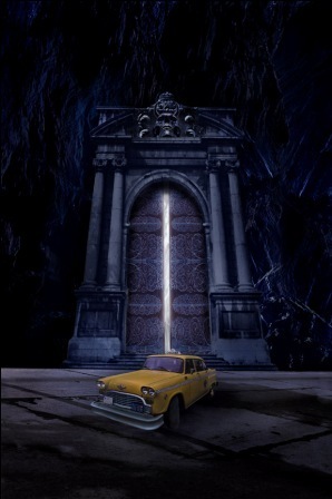 I worked with the cover designer to see if we could preserve the idea, but any kind of monster or statue proved hugely distracting. A taxi cab parked in front of the gate of hell is really intriguing. It poses all kinds of questions and implications. Put a monster in it and you totally lose that. So we worked on keeping the feel while emulating the hardcover. This was the final result: