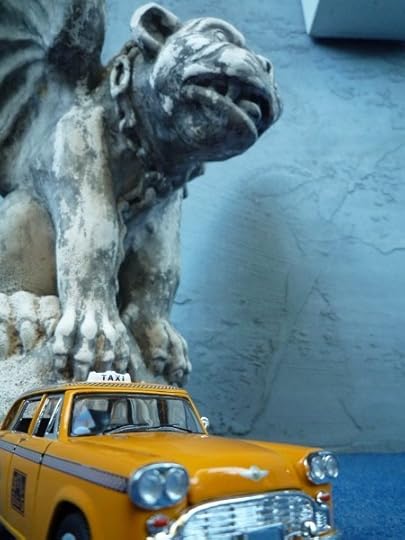 For the e-book & softcover, I was again asked to submit ideas. (Yay!) Conceptually, it was really just going to be a reiteration of the hardcover image. I set a die-cast Checker Cab and a plaster gargoyle in front of a textured wall and took a bunch of pictures. I picked one I liked:
