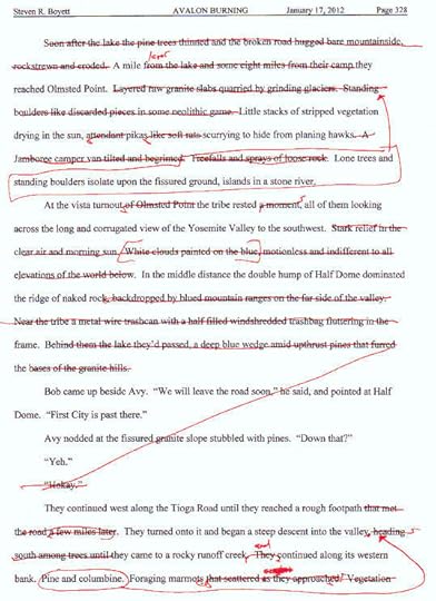 I've just finished the next round of revisions on Avalon Burning, wherein I sprinkled magic adrenalin dust on the manuscript to amp things up a bit and set up the final act. I'll start making the changes on the computer tomorrow. I left myself a couple of [INSERT AMAZING SHIT HERE] spots, so there'll be more work on the computer than simply transcribing my handwritten changes. I tend to separate my current self from my editing self, so that when I'm entering changes I sometimes regard them as having been made by someone else, and it's not uncommon for me to stare at some note on the manuscript and say, "Why, you son of a bitch." Perhaps my process is unconventional. Or maybe a lot of writers do this. I dunno.