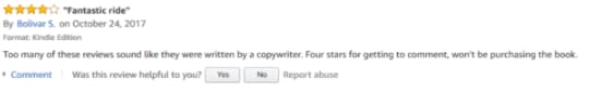 Apparently this proved too unbelievable for reviewer Bolivar S., who wrote: “Too many of these reviews sound like they were written by a copywriter. Four stars for getting to comment, won’t be purchasing the book.”