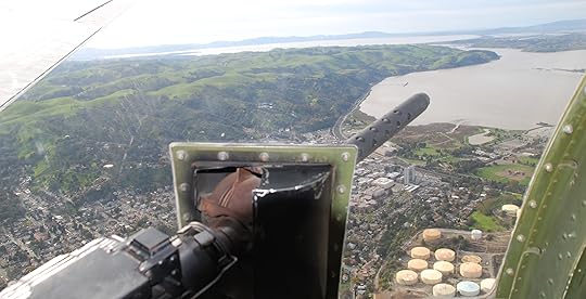 Next day I tightened my vintage military seatbelt and felt the runway drop away as the Aluminum Overcast took to the air and flew along the Carquinez Strait — where I live. I shot pix like a madman and headed straight for the bombardier station in the nose. A camera operator from Channel 2 news took this shot with my phone. My house isn’t in the background — but it’s close.