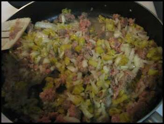 Brown hamburger. Dice onion and halfway through the browning process, add onion and garlic. Chop pepperoncini and cinnamon. Add sauce. Simmer for 20 minutes until flavors have melded together.