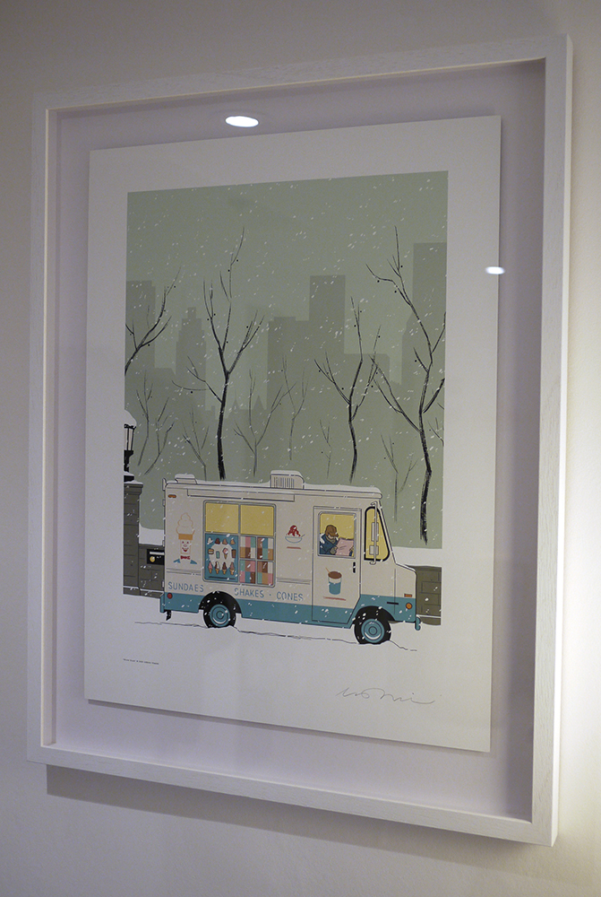 Simon Hillier of London just got his "Winter Break" print back from the framers and shared this snapshot with us. Simon writes, "The technical description is dry mount, reverse cut, black shadow, floated at 5mm. Basically that means they used archival quality wax glue to mount it, used a black foamboard to cast a darker shadow, and cut the board at something like 45º so you don't see the edge." Thanks, Simon!
